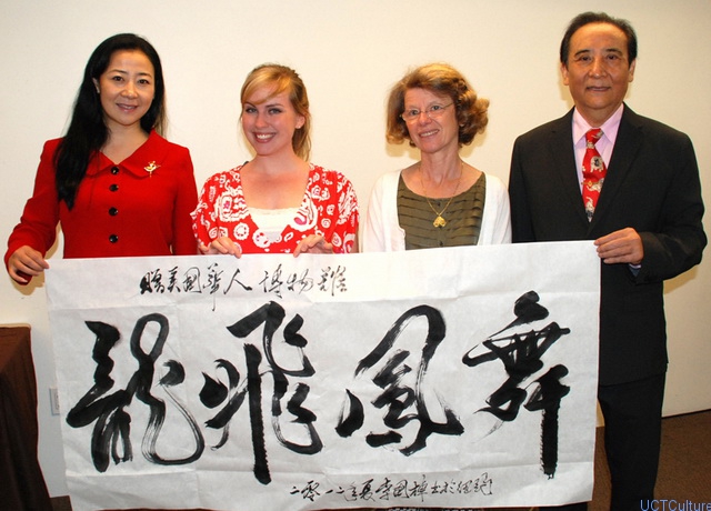 14. 李国栋教授2012年7月25日在美国华人博物馆举办讲座时, 该博物馆收藏李教授书法“龙飞凤舞”。Prof Guodong Li pose and Lydia Reinhold give lecture on July 25th, 2012 in the Museum of Chinese Americans, and the Museum collects Prof. Li’s calligraphic work “Dragon Flies and Phoenix Dances.”.